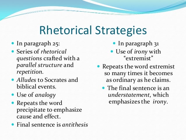Letter from Birmingham City Jail Latest answer posted August 12 2017 at 123201 PM Give examples of ethos pathos and logos in Kings Letter from Birmingham City Jail. King tells the clergymen that he was upset about their criticisms and that he wishes to address their concerns.